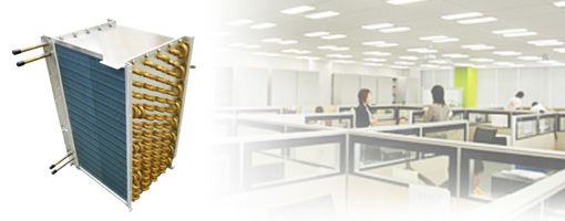 工場設置用冷水コイル。水が流れる熱交換器に風を当て、冷風を作り出します。